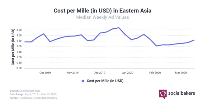 For the time being, the US is experiencing a very similar trend as it continues to fight the pandemic; average costs in East Asia have returned to roughly the same rate as they were seven months prior, reflecting the slow return to ‘business as usual in the region. While East Asia hasn’t seen the same peak in ad value as there once was towards the end of December (a CPM upwards of $3.50), it is likely to be seen as positive news for the ad industry there.