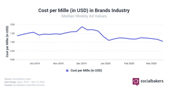The average social ads CPM (Cost per thousand impressions) for brands is valued at $0.81 by analysis from SocialBakers. It is steadily declined since the beginning of the coronavirus outbreak. In November 2019, the CPM peaked at $1.88, twice the current value. Brands like consumer electronics and telecoms declined at the same rate during the first three months of 2020.