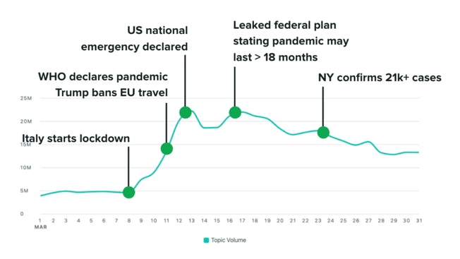 SproputSocial study reveals that global Twitter conversation neighbouring the coronavirus pandemic quadrupled in March. Survey also found that global posts speared to 5-6 million after the hit of the US stock market, which remained at one million per day during February. As the US announced a state of emergency in mid-march, topic volume rose 20 million from around 5 million on the first day. Afterwards, coronavirus conversation continued to exist.