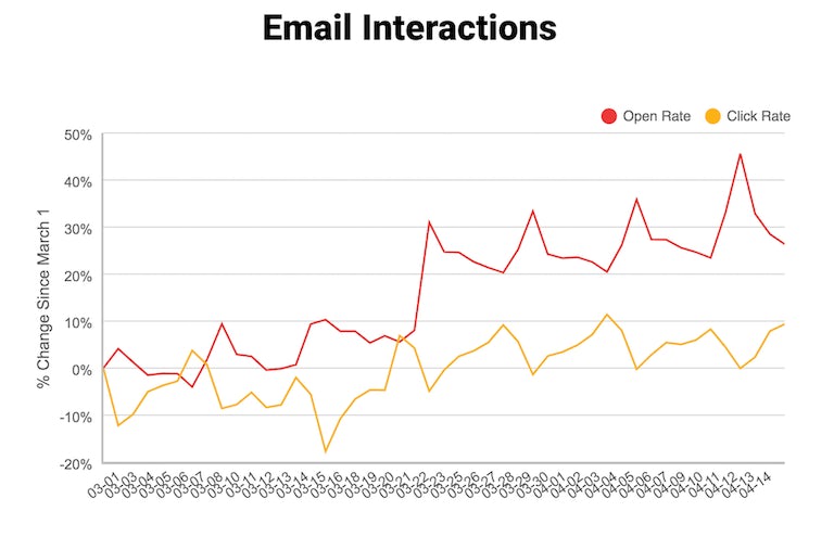 BounceX study suggests that email open rates are 40% up on 14th April than 1st March. However, conversation and website visit rates have been studied and are 10 to 20% lower than what we saw before 1st March.