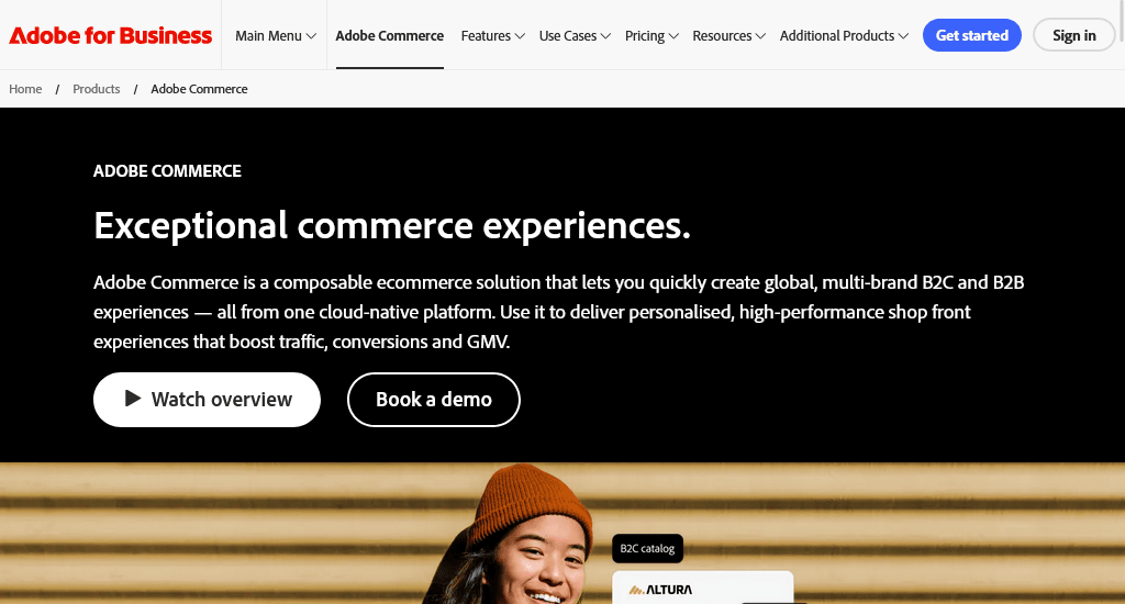 | Adobe Commerce | Large enterprises | Open-source, B2B/B2C, AI merchandising, multi-brand | Custom |